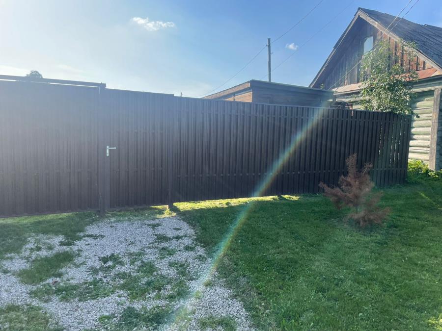 Прямоугольной правильной формы с естественным уклоном. Стоянка для автомобиля, детская площадка. Огорожен забором. Имеется хозблок 2*6 м. Мангальная зона.