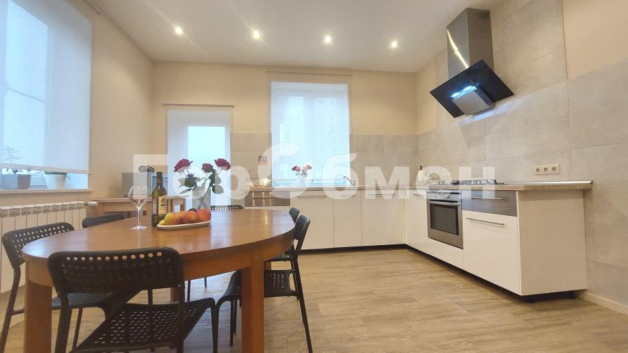 Коттедж оборудован современной мебелью. Кухонный гарнитур укомплектован встроенной техникой.