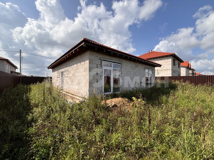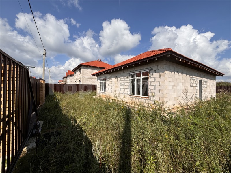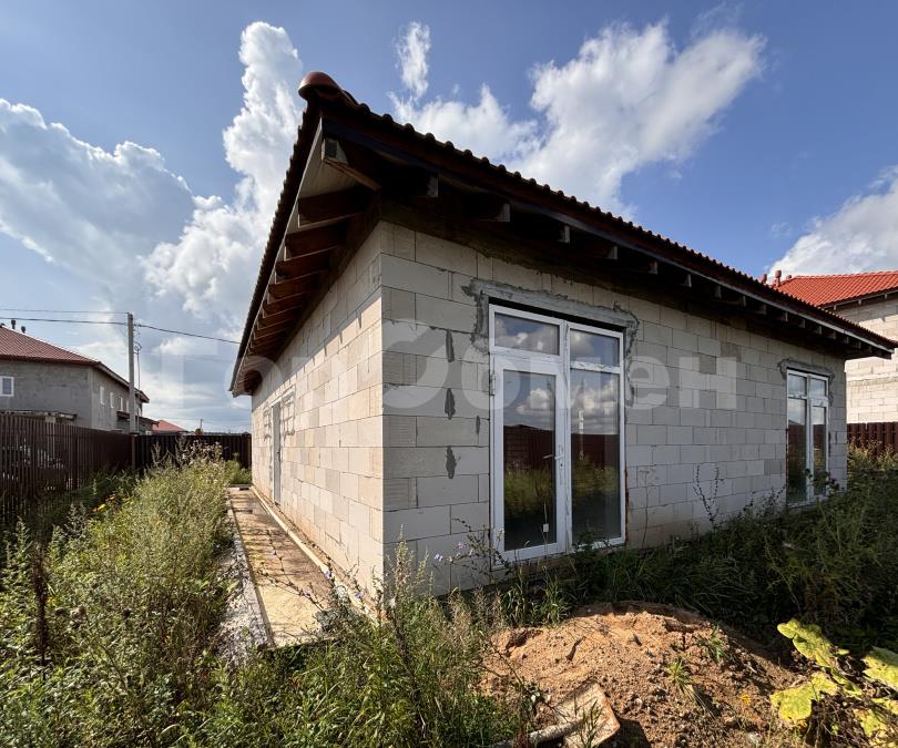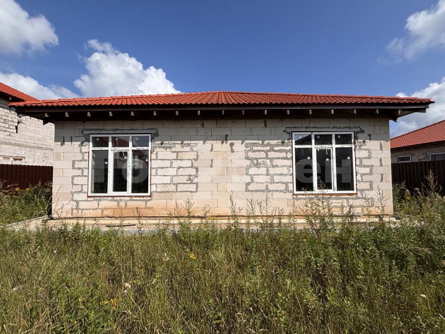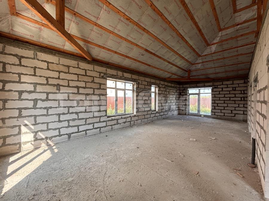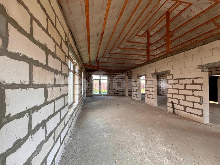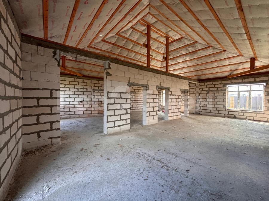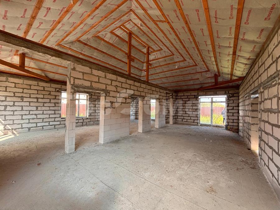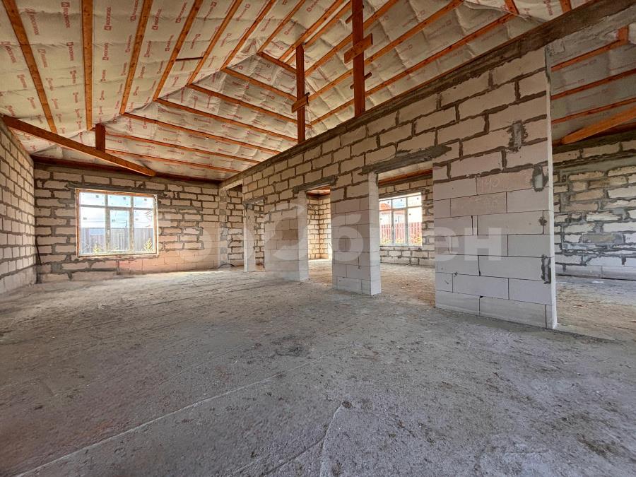 Дом под отделку площадью 119,6 кв.м, выполнен из газоблока, на монолитной плите, фундамент утеплен, установлены стеклопакеты, крыша керамочерепица, кровля утеплена (утеплитель 200), залита отмостка вокруг дома под отделку плиткой. Высота в коньке 5 м.