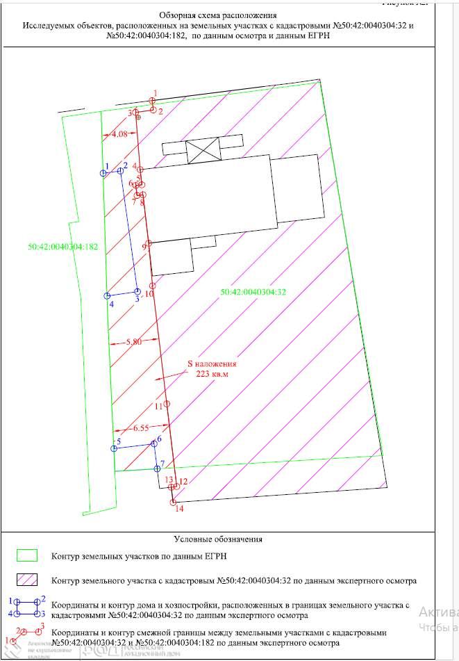 Жилой дом - 225,3 кв. м, земельный участок - 1 200 кв. м, адрес: Московская обл. , г. Долгопрудный, мкр-н Хлебниково, ул. Красноармейская, д. 9а, 2-этажный, кадастровые номера 50: 42: 0000000: 3439, 50: 42: 0040304: 32, земли населенных пунктов - индивидуальное жилищное строительство; на территорию земельного участка наложены границы соседнего участка с кадастровым номером 50: 42: 0040304: 182 (площадь наложения - 223 кв. м согласно заключения специалистов ООО «Экспертиза и управление недвижимостью» № А303 от 01.07.2024) , частично заходят капитальные строения соседнего земельного участка (дом и хозяйственная постройка) , в связи с чем фактическая площадь земельного участка - 977 кв. м, не соответствует данным ЕГРН 1200 кв. м, также на территории участка расположено нежилое здание (гараж) с кадастровым номером 50: 42: 0000000: 3440 находящееся не в собственности банка, ограничения и обременения: зарегистрированные в жилом помещении лица и право пользования жилым помещением у третьих лиц отсутствует, предусмотренные статьей 56 Земельного кодекса Российской Федерации, ЗОУИТ50: 00-6.2819 Шестая подзона приаэродромной территории аэродрома Москва (Шереметьево) , ЗОУИТ50: 00-6.2783 сектор 3.3 третьей подзоны приаэродромной территории аэродрома Москва (Шереметьево)