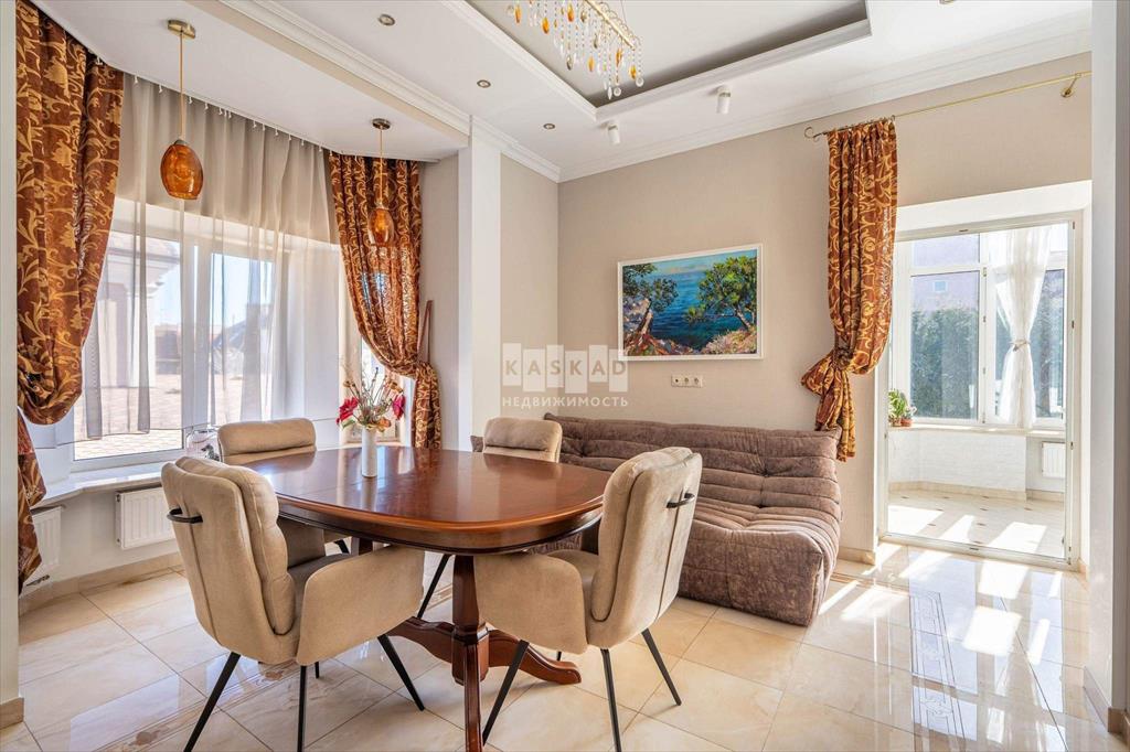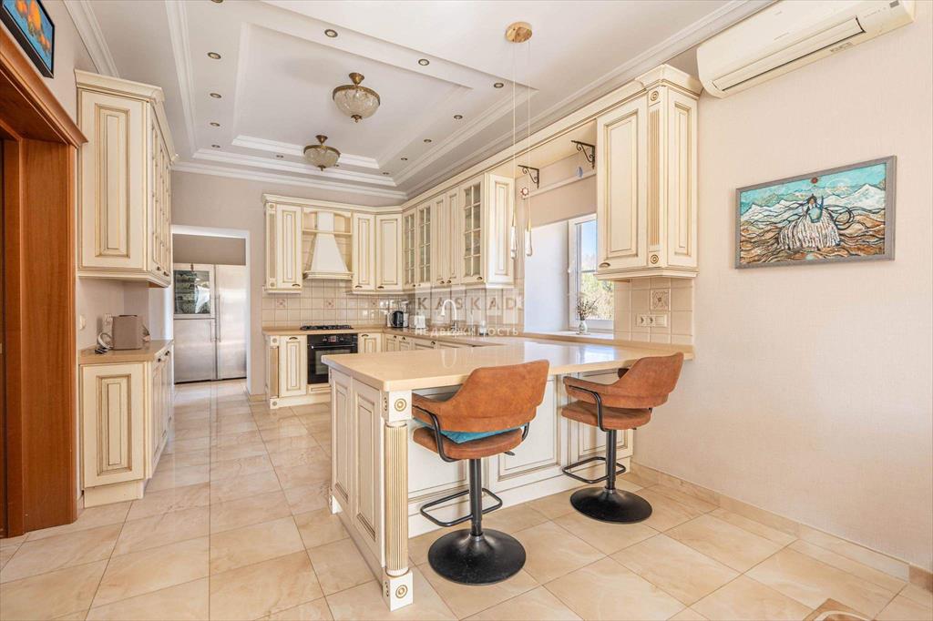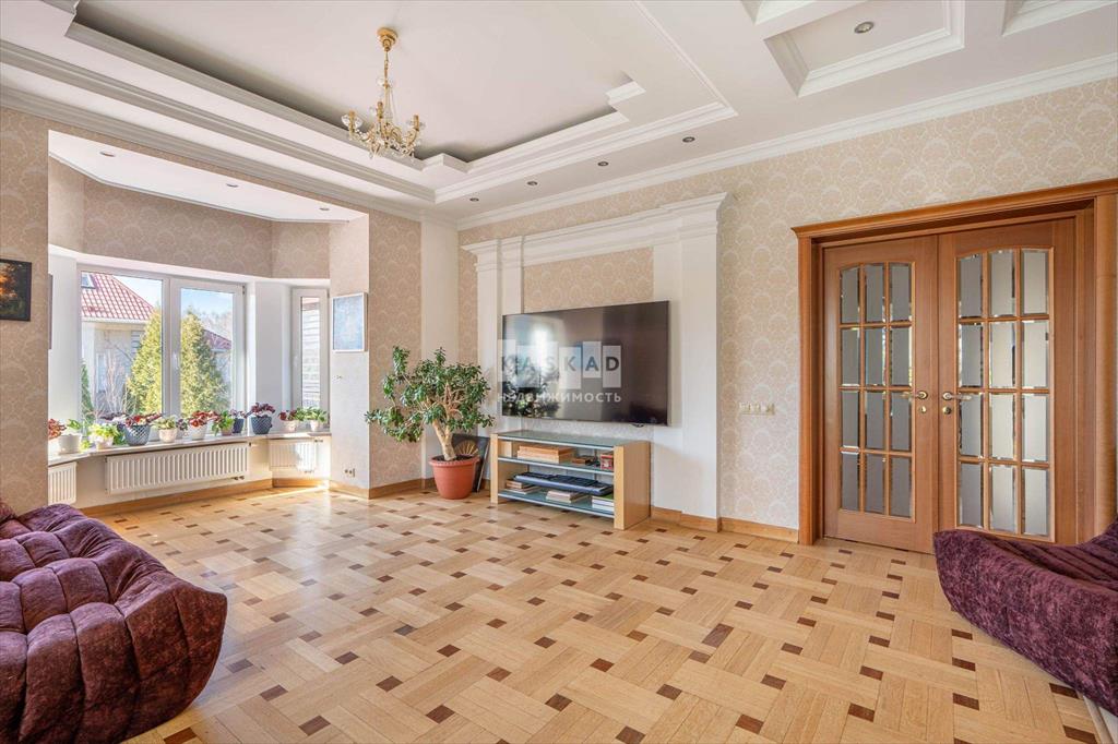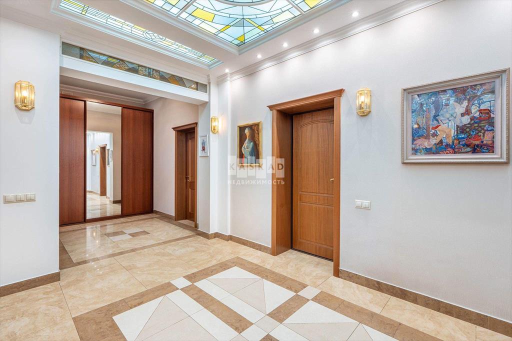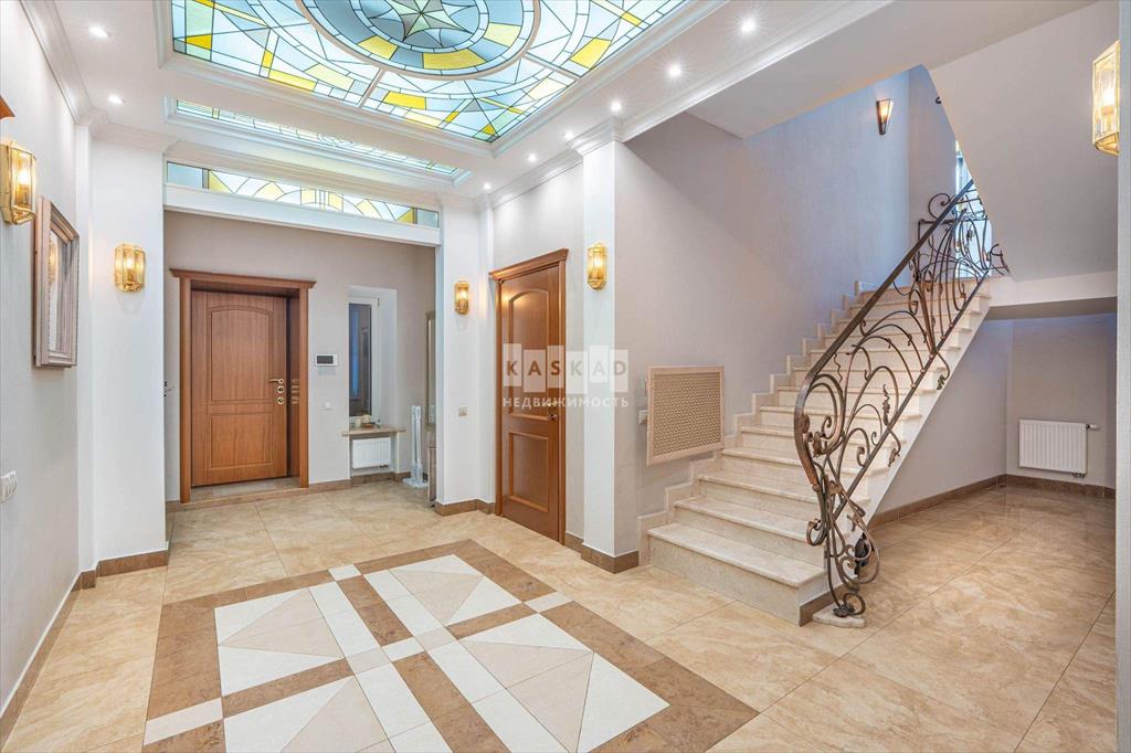 Внутри коттеджа - светлая и приятная отделка, выдержанная в основном в светлых тонах. Полы выполнены из мрамора, керамогранита и наборного паркета с подогревом на первом и втором этажах, а также в санузлах на третьем. Мраморная лестница с коваными перилами, лестничная площадка освещена витражными окнами, добавляющими естественного света. Потолки в некоторых комнатах украшены витражной подсветкой.