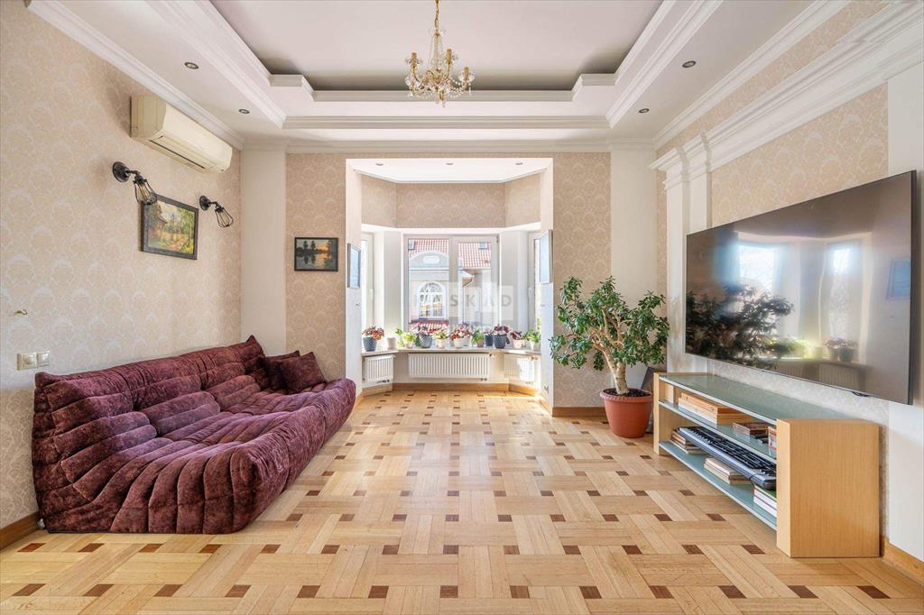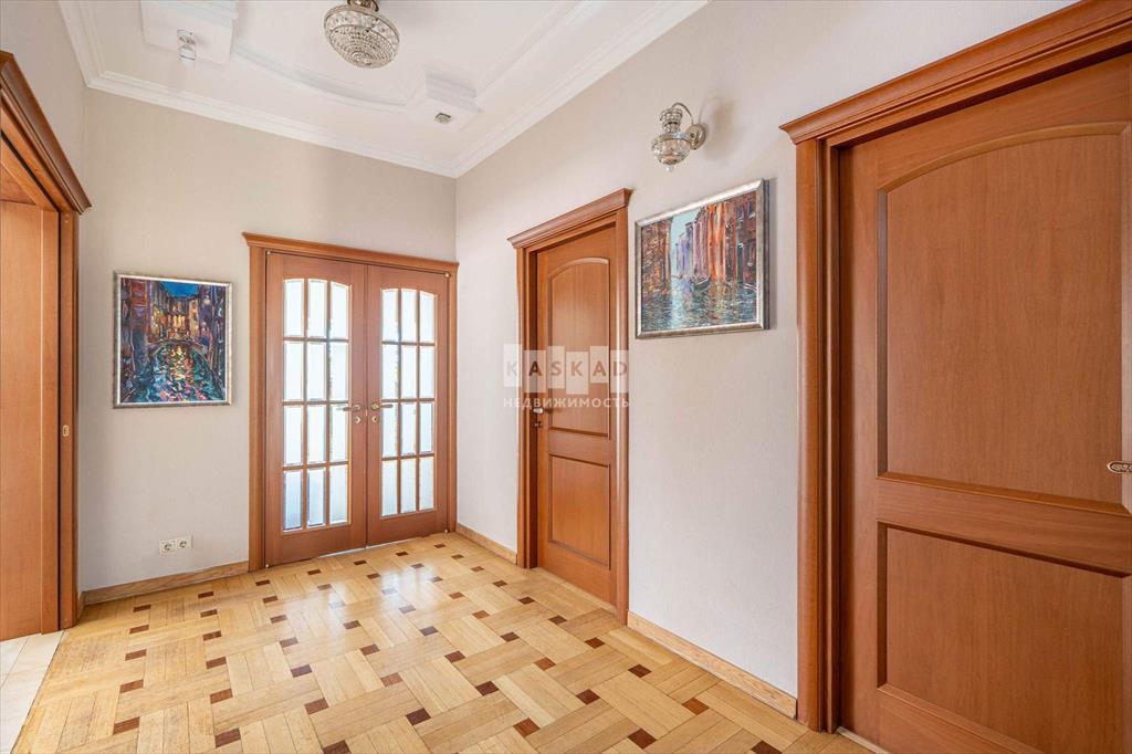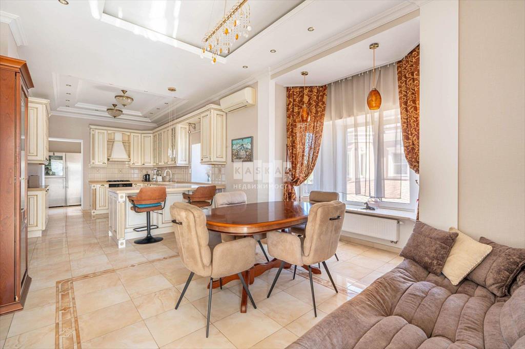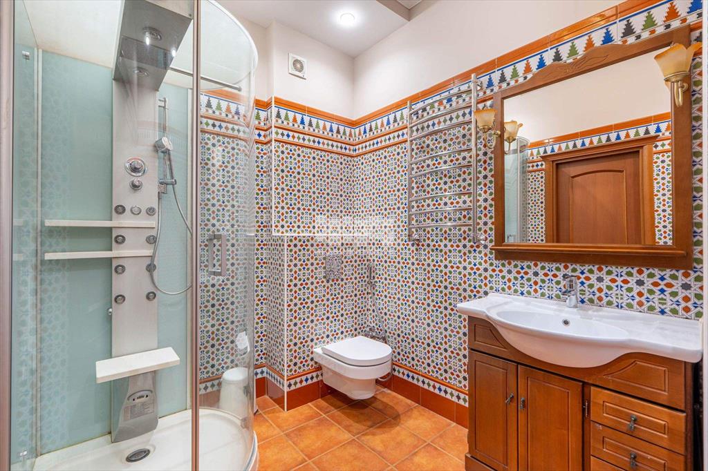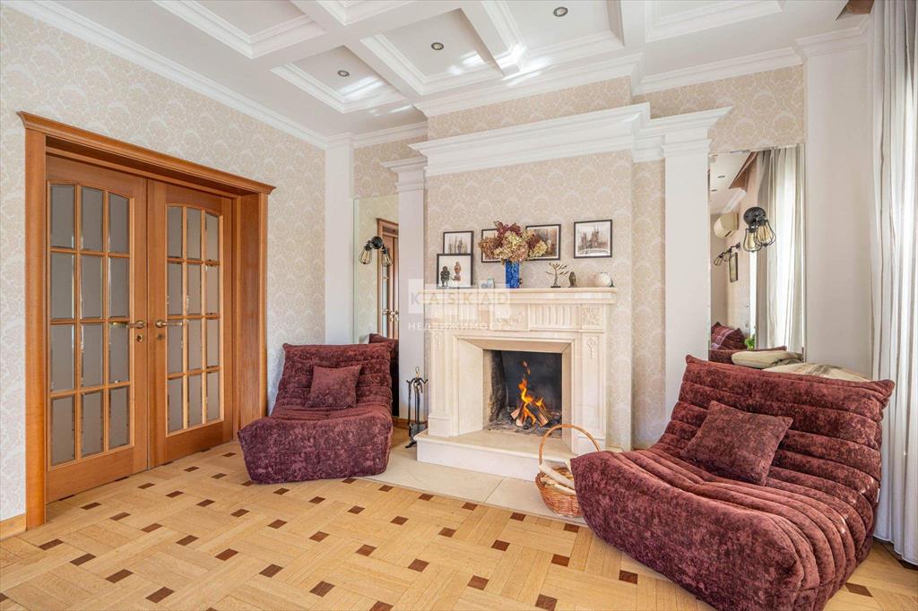 Внутри коттеджа - светлая и приятная отделка, выдержанная в основном в светлых тонах. Полы выполнены из мрамора, керамогранита и наборного паркета с подогревом на первом и втором этажах, а также в санузлах на третьем. Мраморная лестница с коваными перилами, лестничная площадка освещена витражными окнами, добавляющими естественного света. Потолки в некоторых комнатах украшены витражной подсветкой.