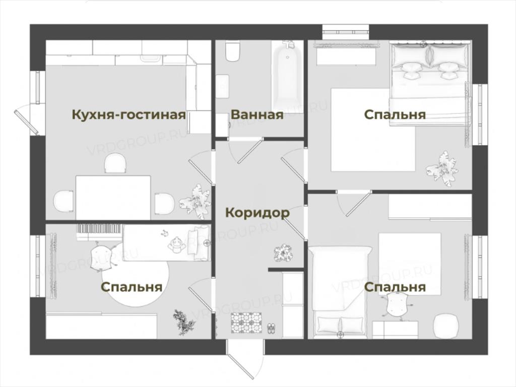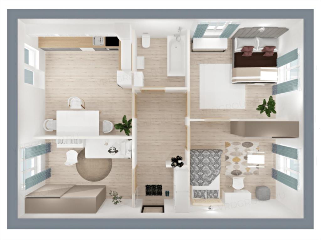 Количество комнат: 2 спальни + кухня-гостиная