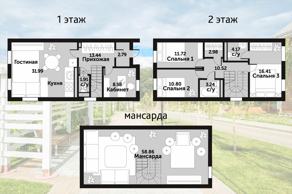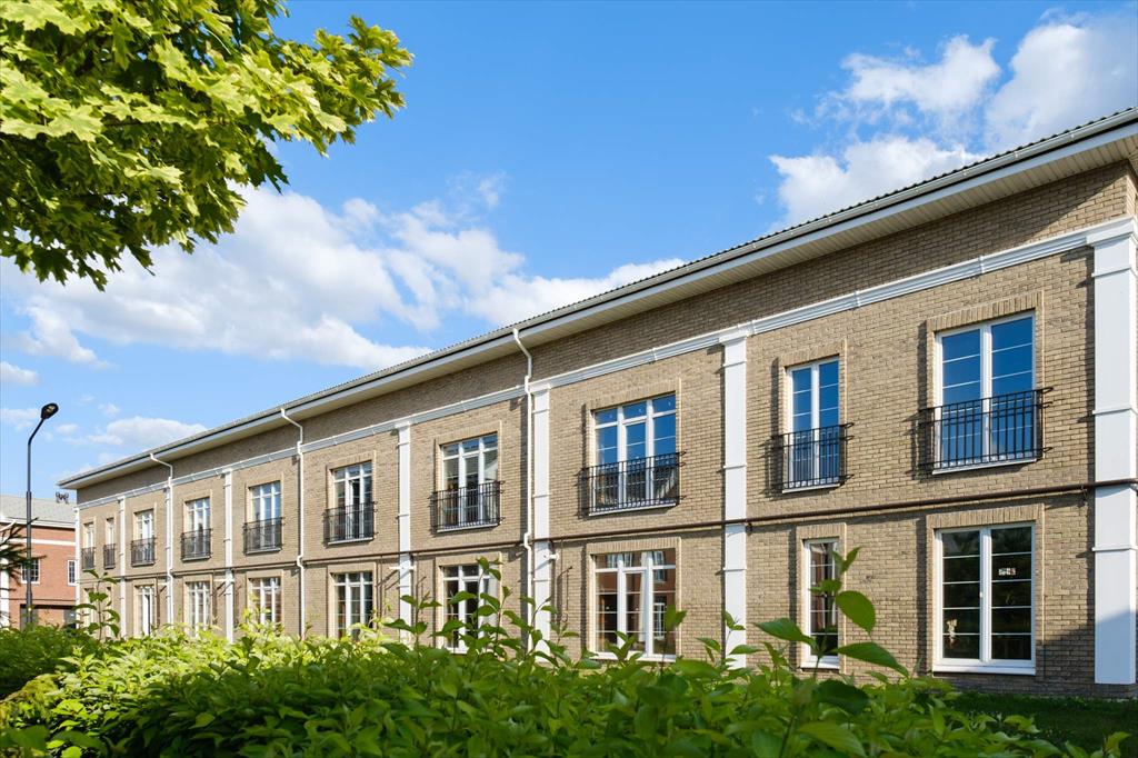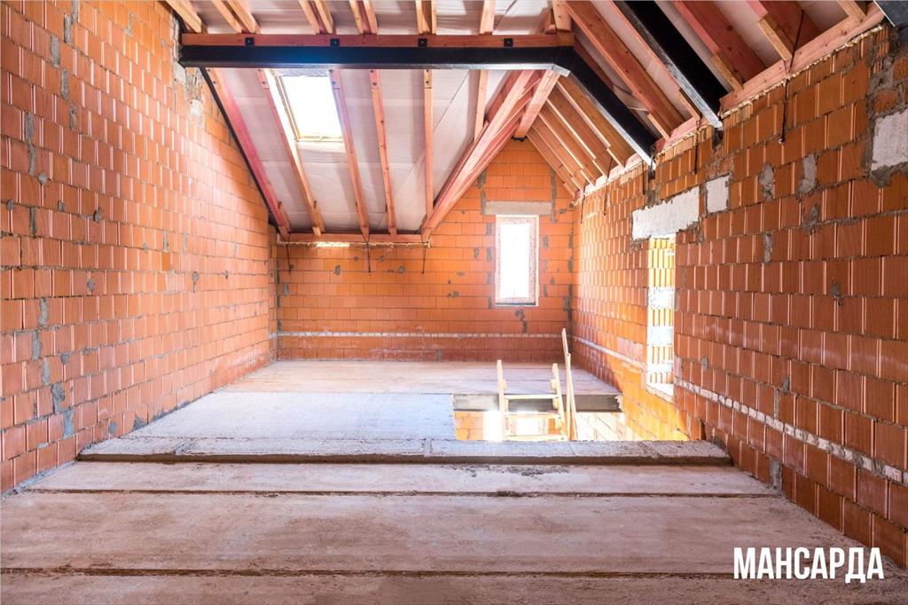 Без отделки, свободная планировка. 1 и 2 этаж - 118,55 м2 и полноценная мансарда - 48,69 м2 с высокими потолками. Много света в таунхаусе, окна выходят на три стороны света.