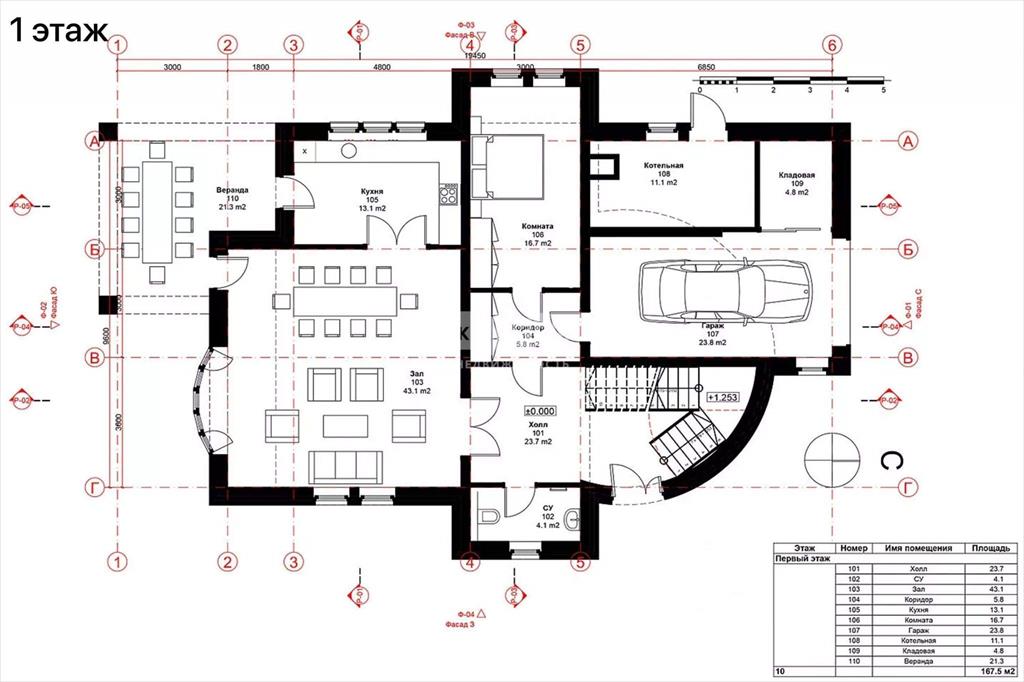 1 этаж: прихожая, холл, кухня - столовая с выходом на террасу, гостиная, гостевая спальня, санузел, гараж на 1 м/м, котельная;