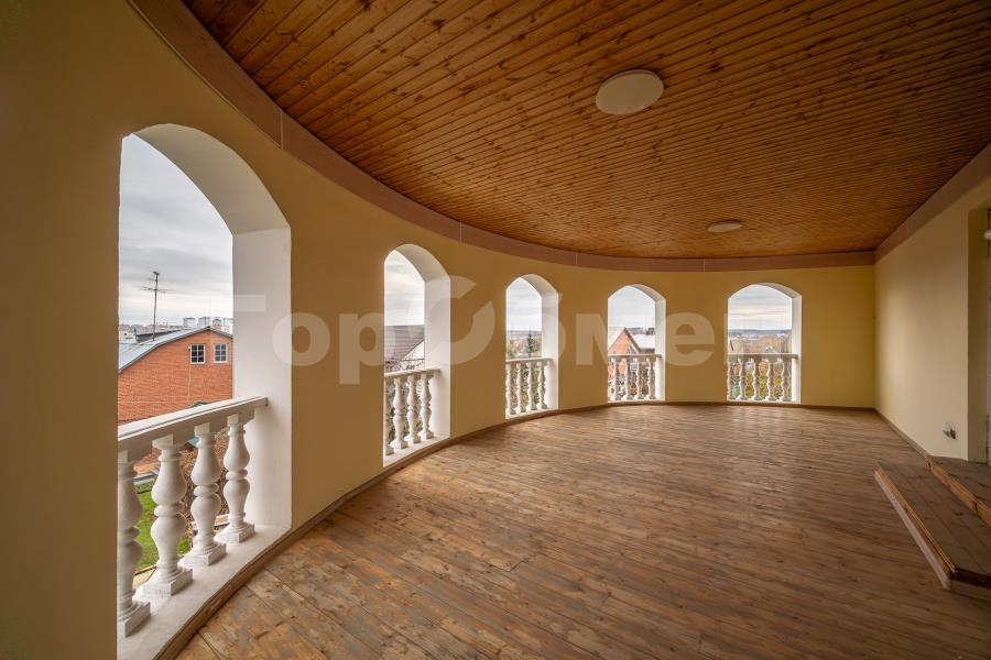 Просторная круглая терраса с колоннами станет центром притяжения по вечерам, создавая атмосферу тепла и домашнего уюта.