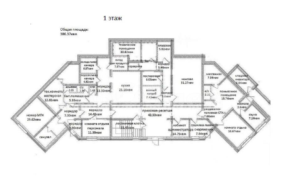 1 этаж: Кухня- бар, кинозал, Сауна и массажная, винный погреб, постирочная, морозильная и холодильная камеры, сушилка для лыжного инвентаря кладовая для хоз. нужд и оборудования, техническое помещение, кабинет администратора