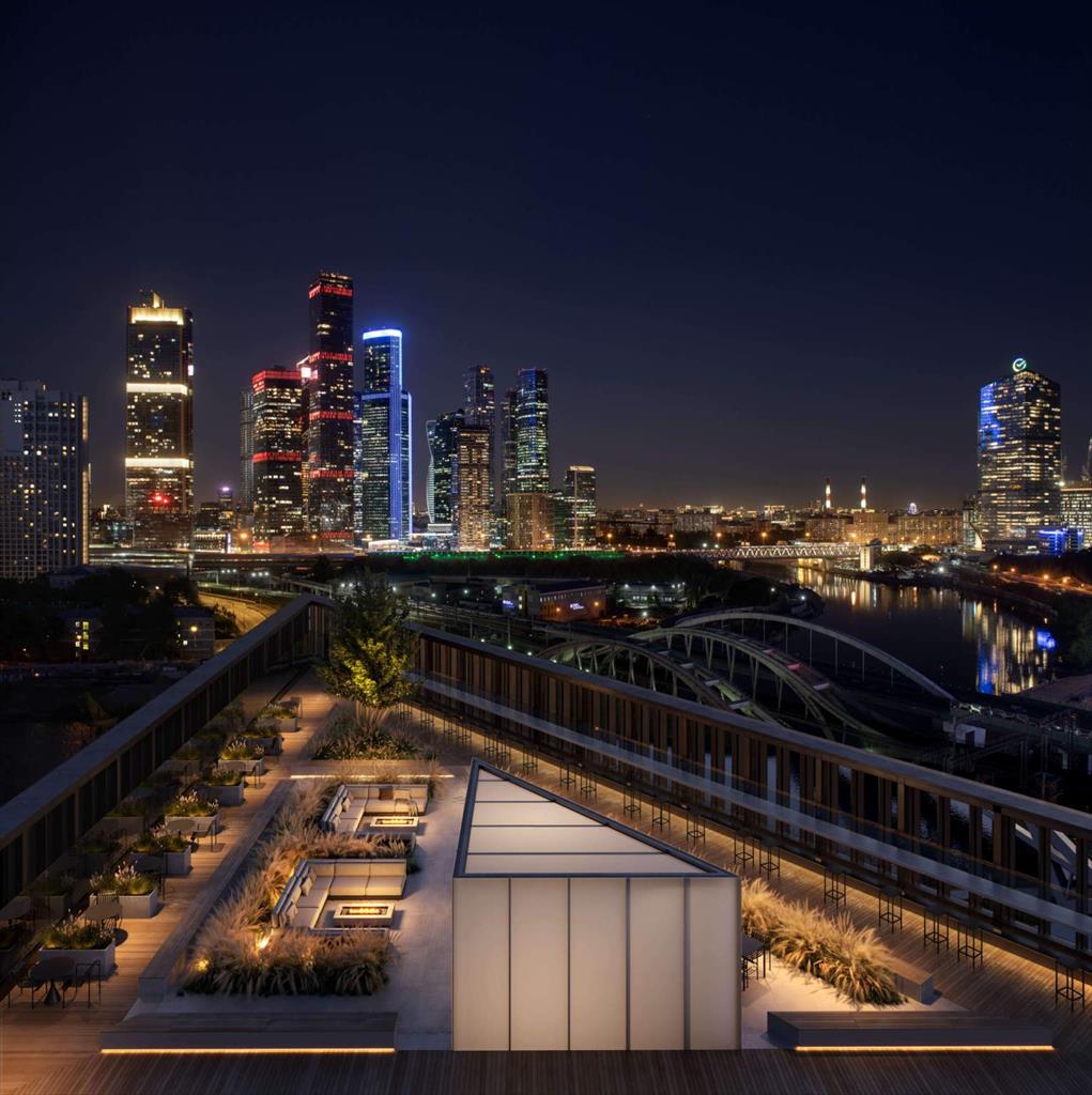 -Эксплуатируемая кровля с террасой и панорамным видом на Москва-Сити;