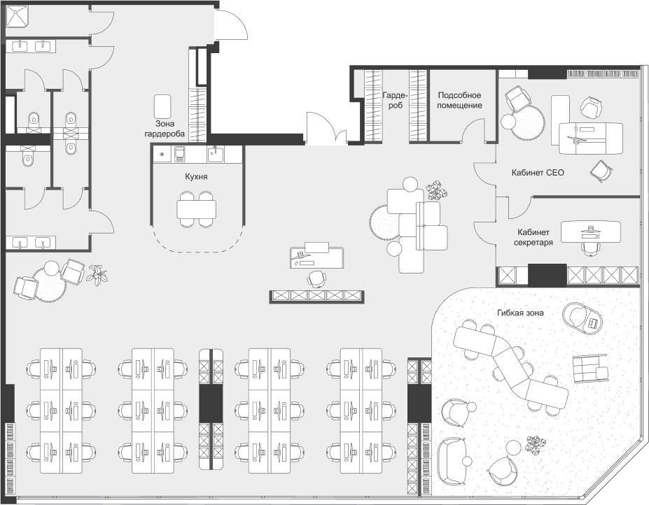 12) Отсутствие колонн в углах здания позволяет создать кабинеты с панорамными видами, подходящие для руководителей