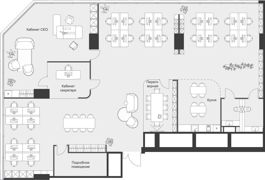 12) Отсутствие колонн в углах здания позволяет создать кабинеты с панорамными видами, подходящие для руководителей