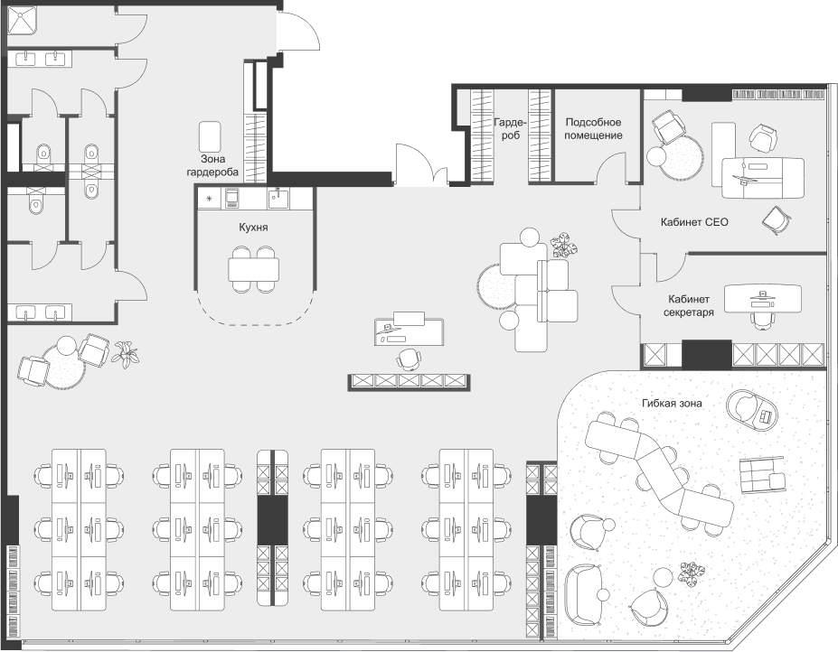 12) Отсутствие колонн в углах здания позволяет создать кабинеты с панорамными видами, подходящие для руководителей