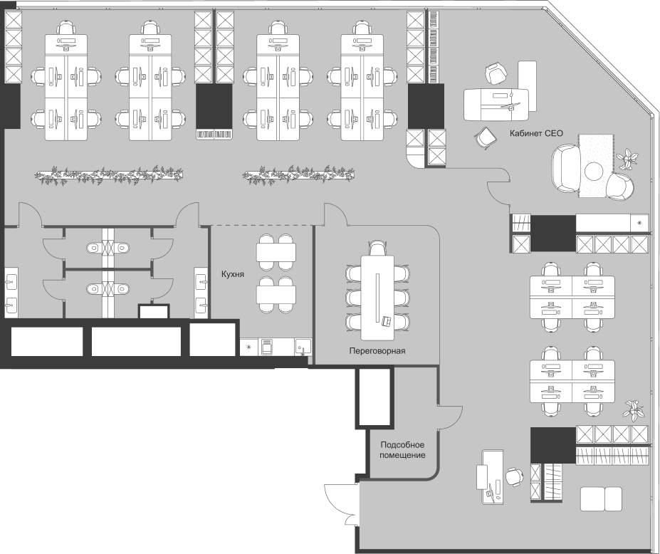 12) Отсутствие колонн в углах здания позволяет создать кабинеты с панорамными видами, подходящие для руководителей