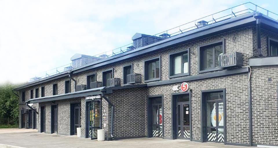 Отделка фасадов выполнена панелями с имитацией клинкерного кирпича. Дополнительно на территории организованы зоны отдыха, имеется возможность для организации летних веранд и кафе.