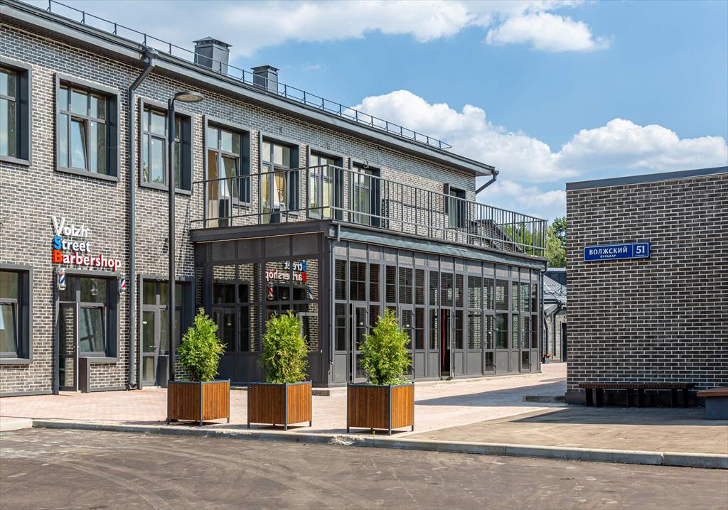 Отделка фасадов выполнена панелями с имитацией клинкерного кирпича. Дополнительно на территории организованы зоны отдыха, также дополнительно имеется возможность для организации летних веранд и кафе.