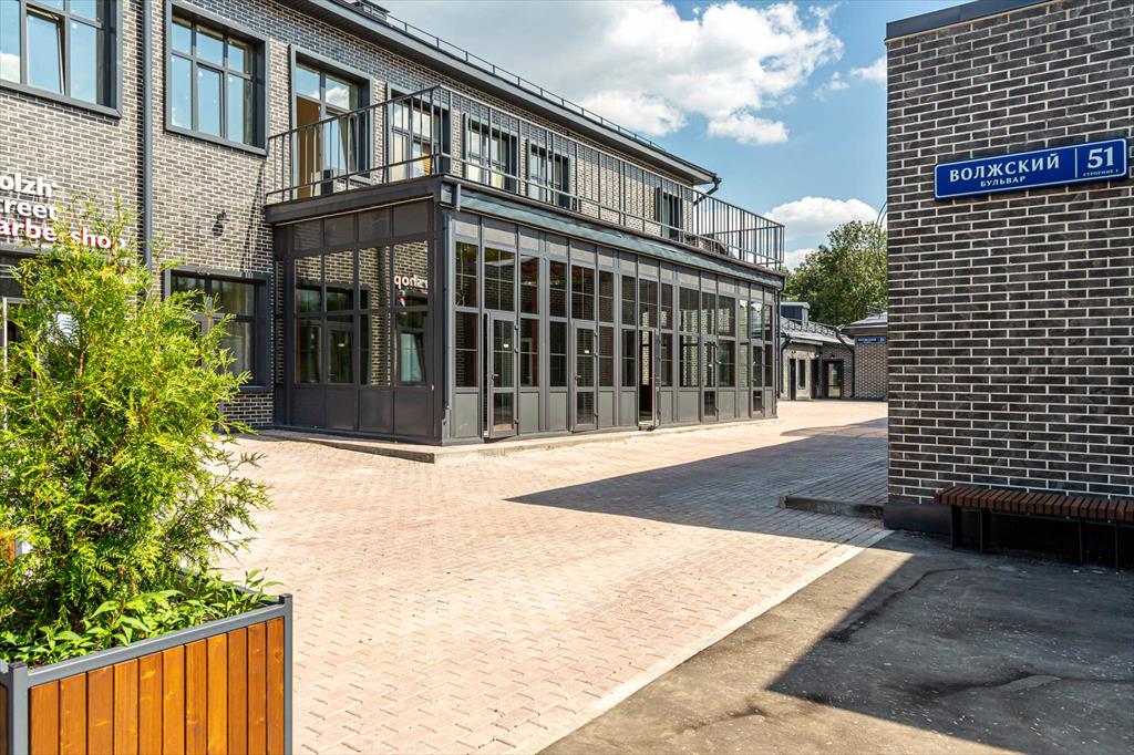 Отделка фасадов выполнена панелями с имитацией клинкерного кирпича. Дополнительно на территории организованы зоны отдыха, также дополнительно имеется возможность для организации летних веранд и кафе.