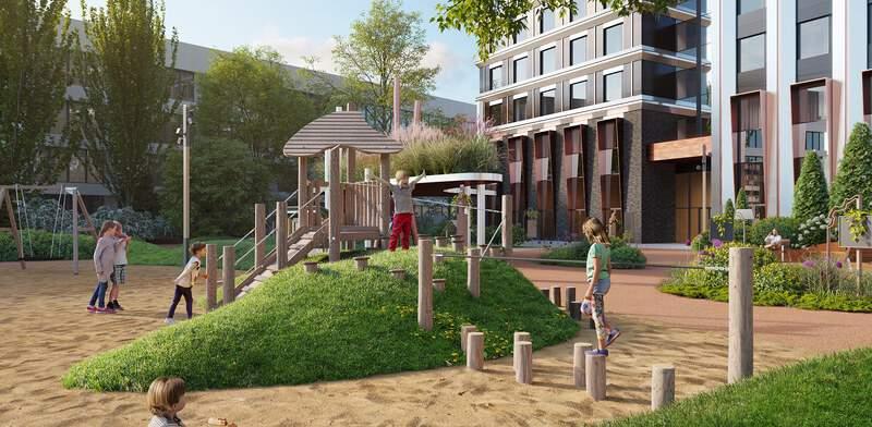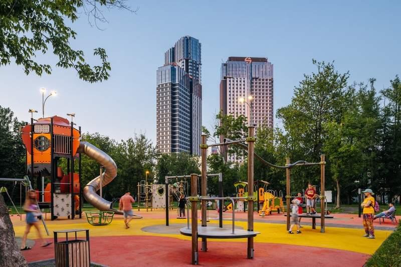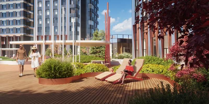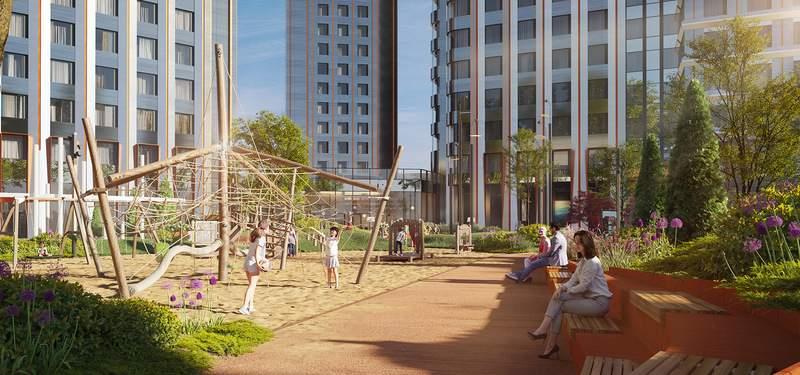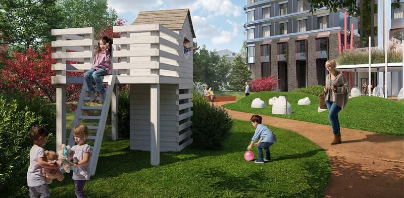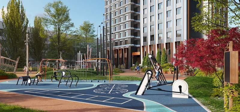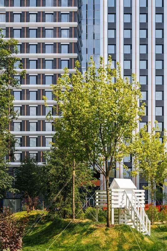 Внешняя территория комплекса условно делится на три зоны. Основная входная группа представляет собой открытую зону коммерческих помещений (кофейня, аптека, салон красоты) . В закрытой зоне внутреннего двора время течет как в замедленной съемке. Скамейки, шезлонги, пуфы, садовые качели приглашают расслабленно провести часок-другой наедине с собой или в небольшой компании. В восточной части территории расположены игровые площадки для детей разных возрастов, а также спортивные площадки. Авторам проекта архитектурному бюро ICube удалось воссоздать атмосферу детских фильмов! |