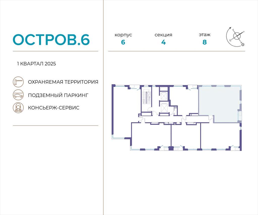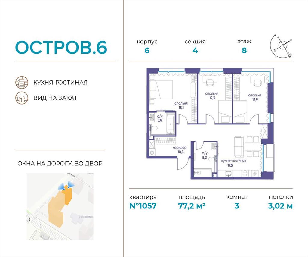 Продаётся 3-комн. квартира от застройщика: общая площадь 77.20 м, жилая 40.30 м, кухня 17.50 м, 8-й этаж, жилой квартал «Остров 6», корпус 6 (секция 4) . Срок сдачи: 1 квартал 2025 года.