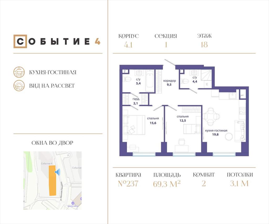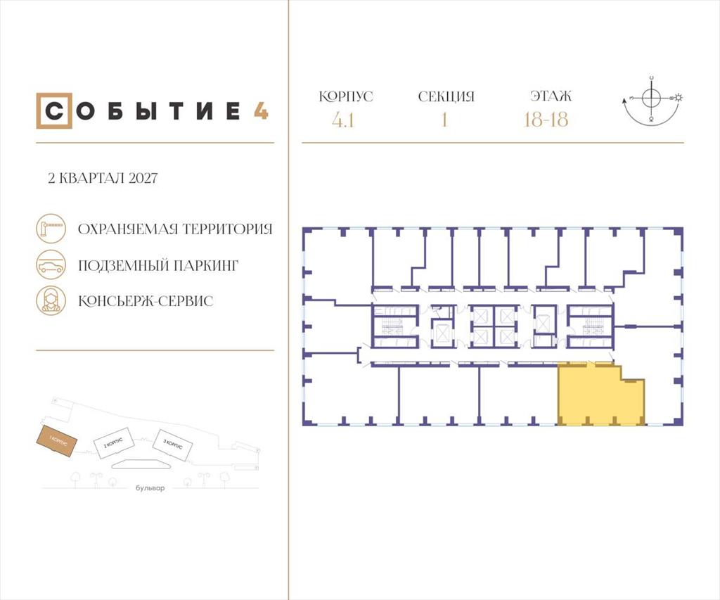 | Продаётся 2-комнатная квартира от застройщика: общая площадь 69.30 м, жилая 28.10 м, кухня 19.80 м, 18-й этаж, жилой квартал «Событие-4», корпус 1 (секция 1) Срок сдачи: 2 квартал 2027 года.