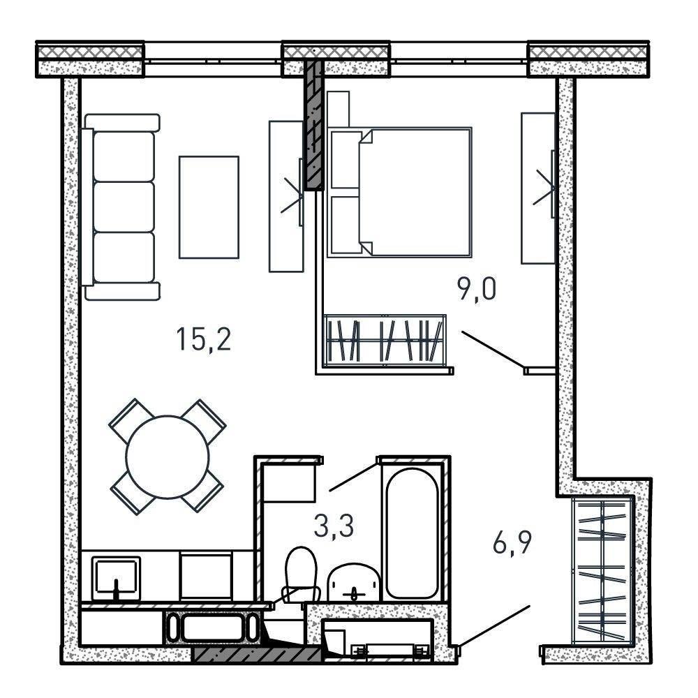 общая 34,4 м2, жилая 9 м2, кухни 0 м2 |