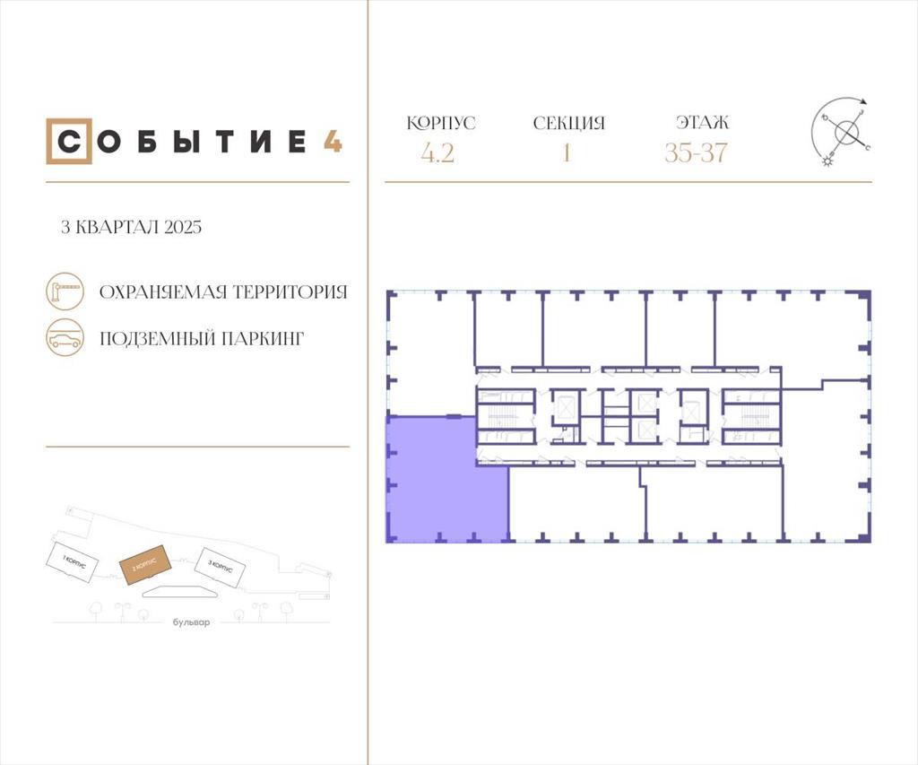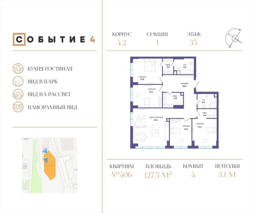 | Продаётся 4-комнатная квартира от застройщика: общая площадь 127.50 м, жилая 55.20 м, кухня 27.40 м, 35-й этаж, жилой квартал «Событие-4», корпус 2 (секция 1) Срок сдачи: 3 квартал 2025 года.