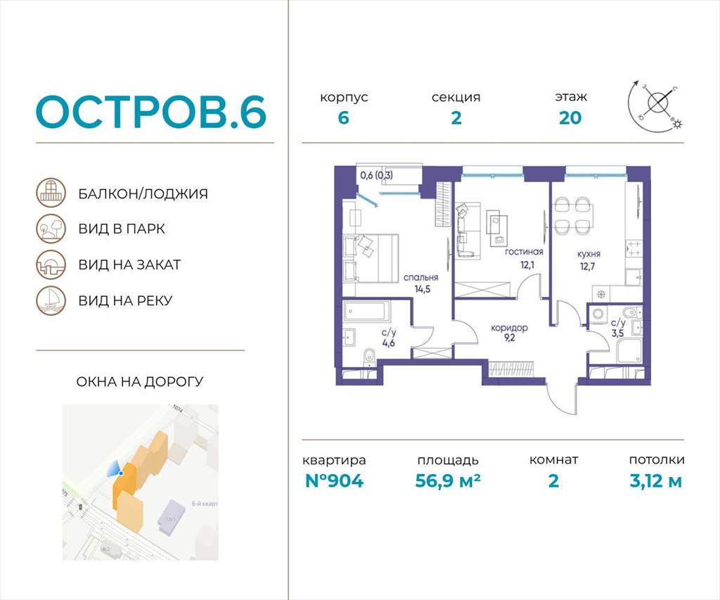 | Продаётся 2-комн. квартира от застройщика: общая площадь 56.90 м, жилая 26.60 м, кухня 12.70 м, 20-й этаж, жилой квартал «Остров 6», корпус 6 (секция 2) . Срок сдачи: 3 квартал 2025 года.