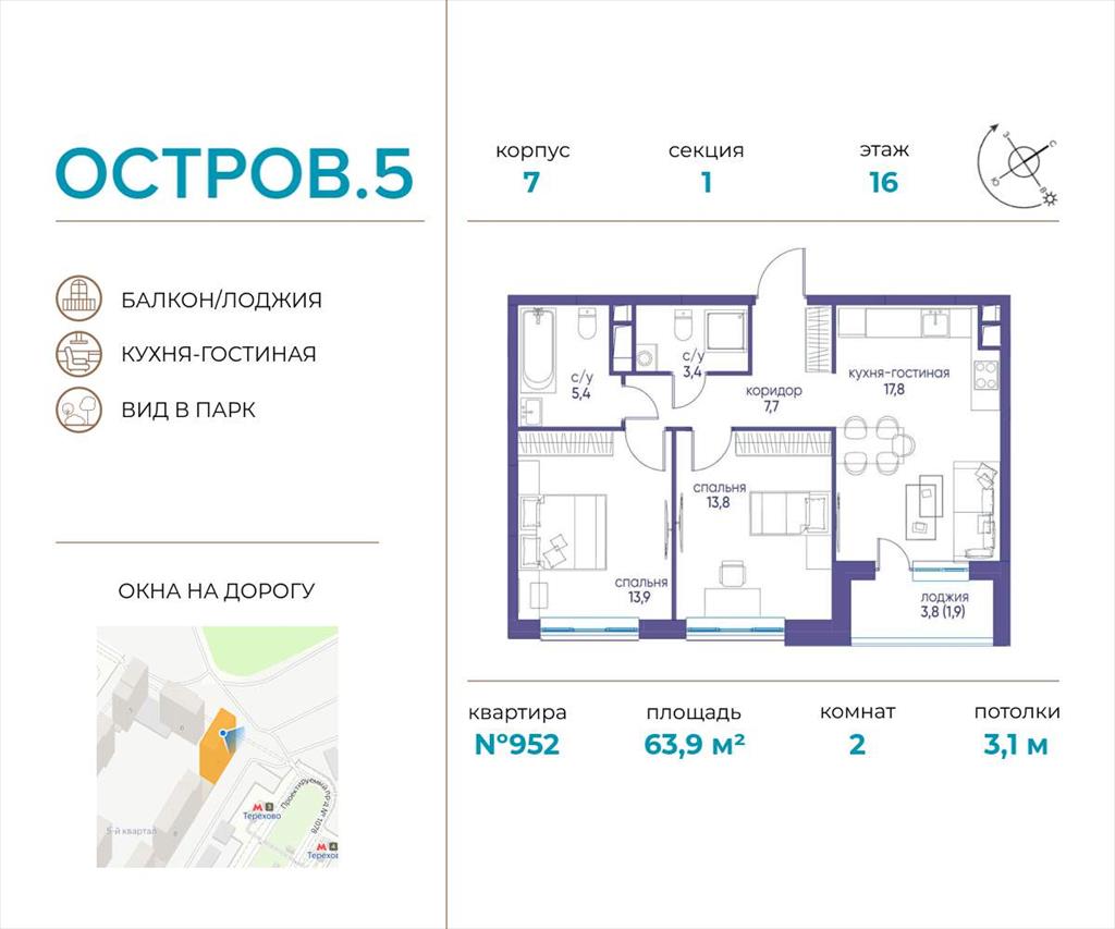 | Продаётся 2-комн. квартира от застройщика: общая площадь 63.90 м, жилая 27.70 м, кухня 17.80 м, 16-й этаж, жилой квартал «Остров 5», корпус 7 (секция 1) . Срок сдачи: 3 квартал 2025 года.