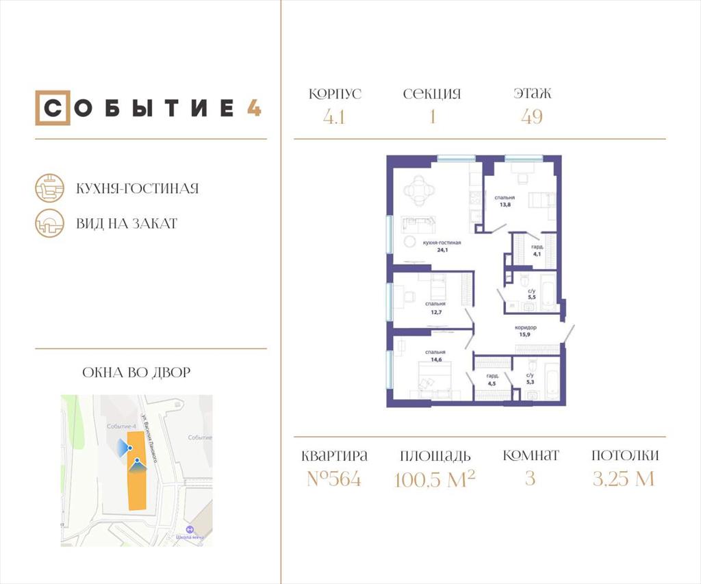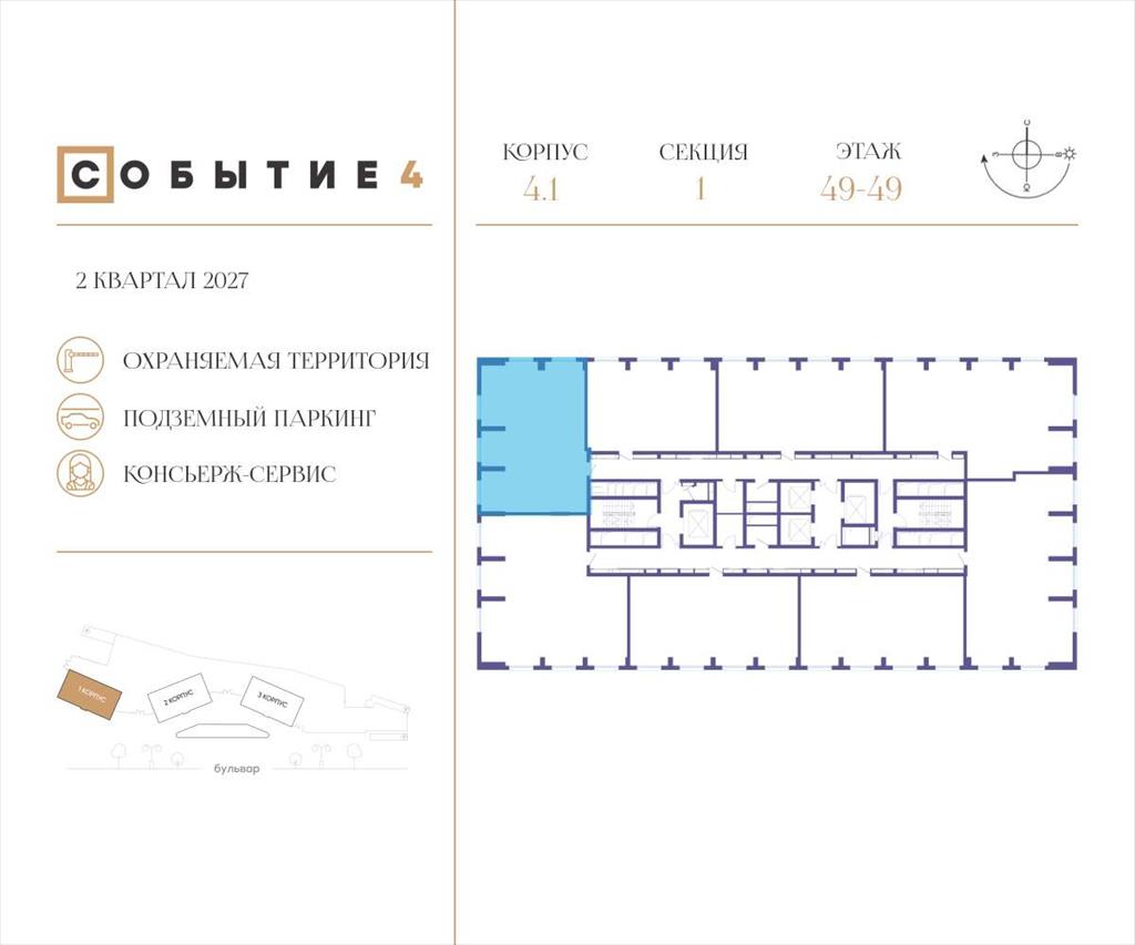 | Продаётся 3-комнатная квартира от застройщика: общая площадь 100.50 м, жилая 41.10 м, кухня 24.10 м, 49-й этаж, жилой квартал «Событие-4», корпус 1 (секция 1) Срок сдачи: 2 квартал 2027 года.