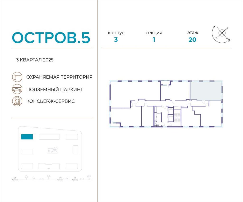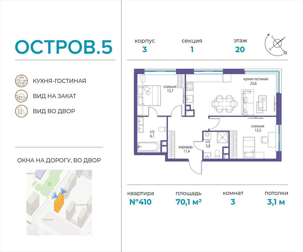 | Продаётся 3-комн. квартира от застройщика: общая площадь 70.10 м, жилая 25.20 м, кухня 23.60 м, 20-й этаж, жилой квартал «Остров 5», корпус 3 (секция 1) . Срок сдачи: 3 квартал 2025 года.
