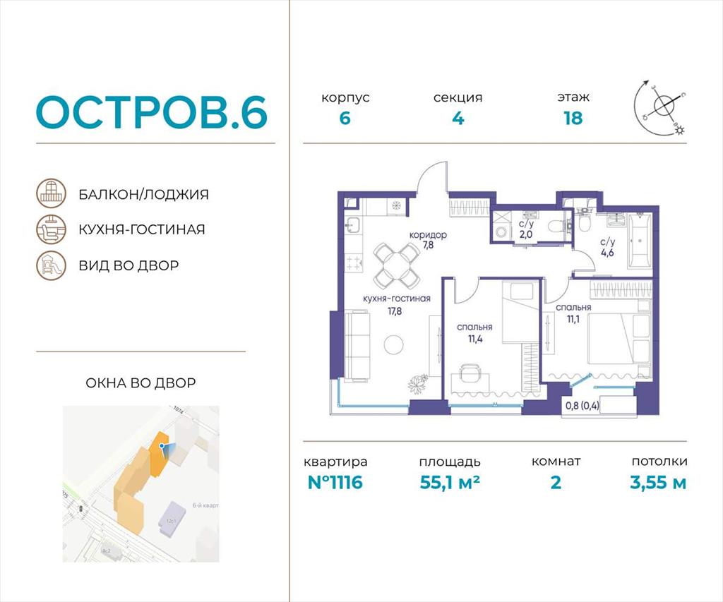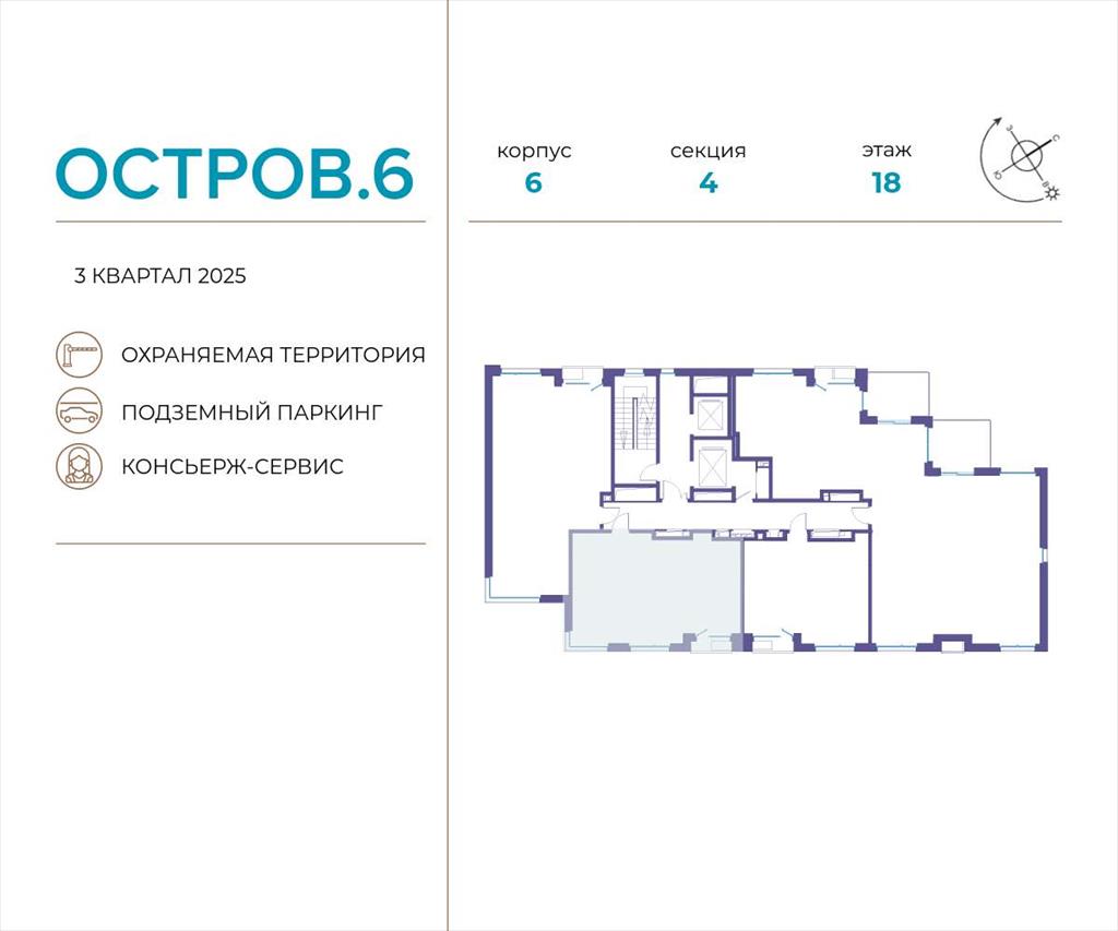 | Продаётся 2-комн. квартира от застройщика: общая площадь 55.10 м, жилая 22.50 м, кухня 17.80 м, 18-й этаж, жилой квартал «Остров 6», корпус 6 (секция 4) . Срок сдачи: 3 квартал 2025 года.