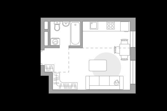 общая 28,82 м2, жилая 15,42 м2, кухни 6,54 м2 |
