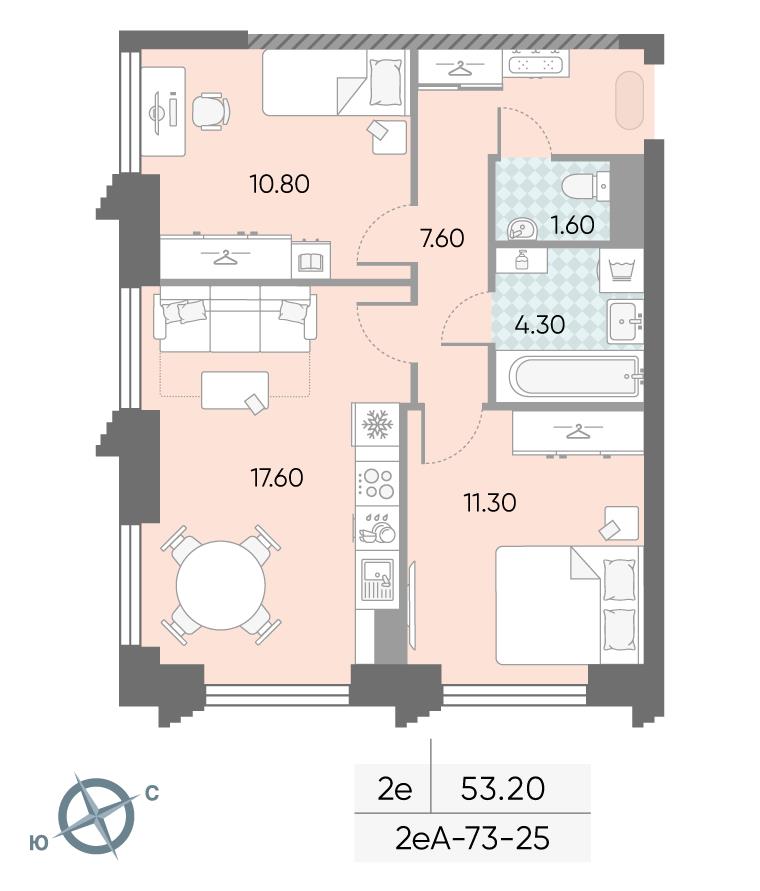 общая 53,2 м2, жилая 35,7 м2, кухни 4 м2 |