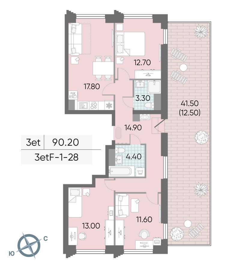 общая 90,2 м2, жилая 51,5 м2, кухни 3,6 м2 |