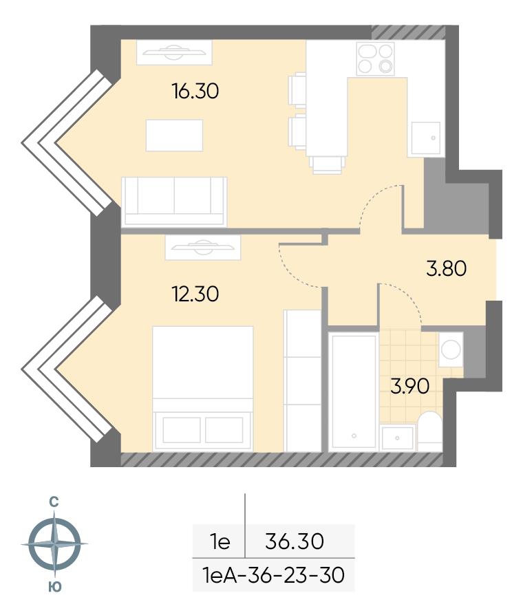общая 36,3 м2, жилая 24,3 м2, кухни 4,3 м2 |