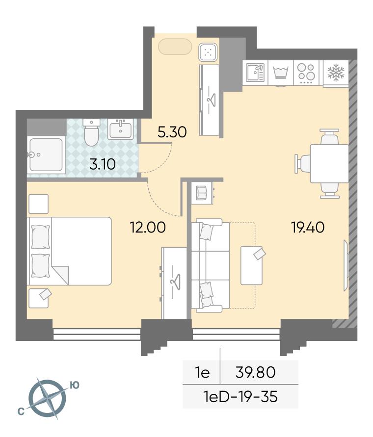 общая 39,8 м2, жилая 27 м2, кухни 4,4 м2 |