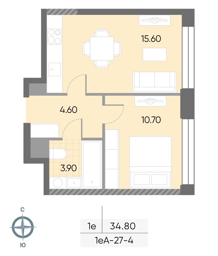 общая 34,8 м2, жилая 21,6 м2, кухни 4,7 м2 |