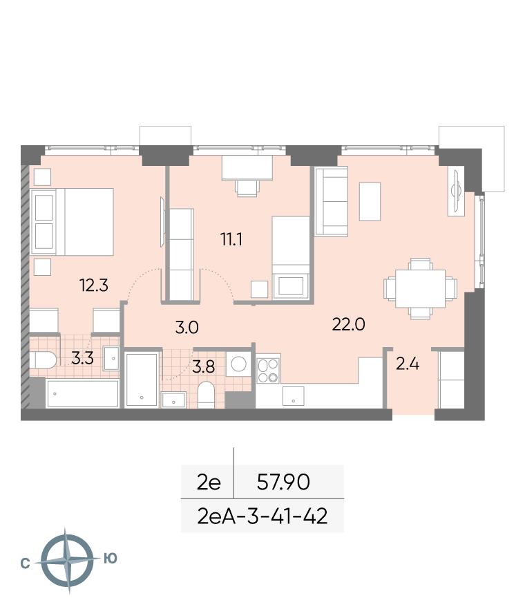 общая 57,9 м2, жилая 23,4 м2, кухни 22 м2 |