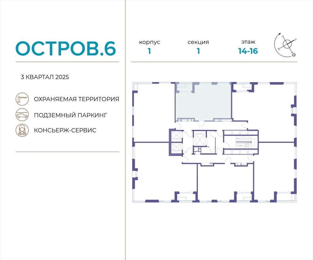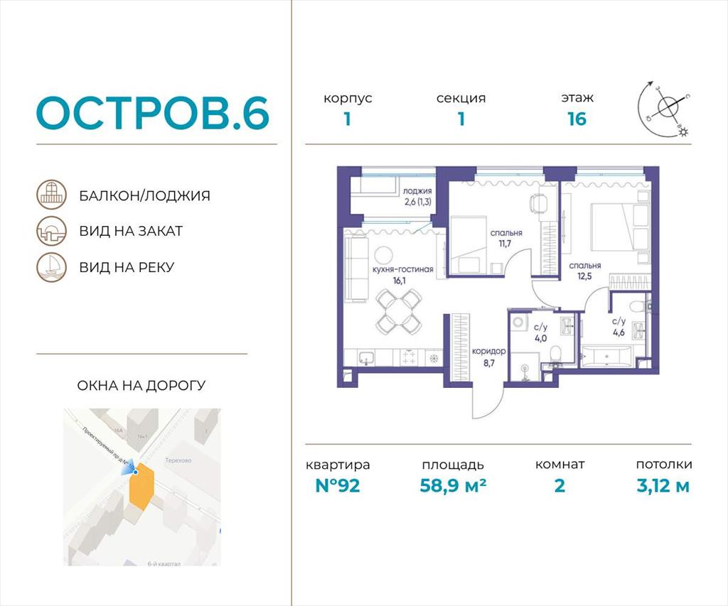 | Продаётся 2-комн. квартира от застройщика: общая площадь 58.90 м, жилая 24.20 м, кухня 16.10 м, 16-й этаж, жилой квартал «Остров 6», корпус 1 (секция 1) . Срок сдачи: 3 квартал 2025 года.