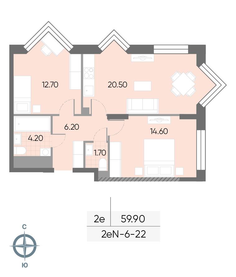 общая 59,9 м2, жилая 42,2 м2, кухни 5,6 м2 |