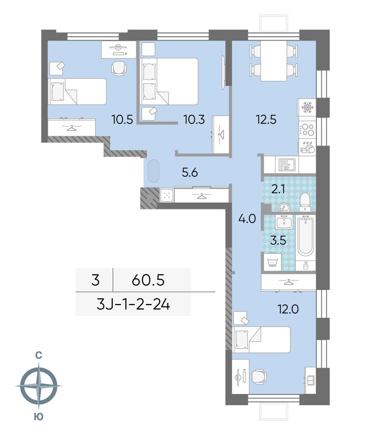 общая 60,5 м2, жилая 32,8 м2, кухни 12,5 м2 |