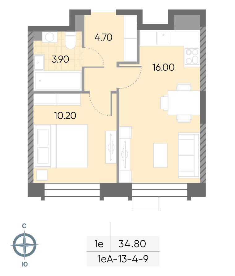 общая 34,8 м2, жилая 23,4 м2, кухни 2,8 м2 |