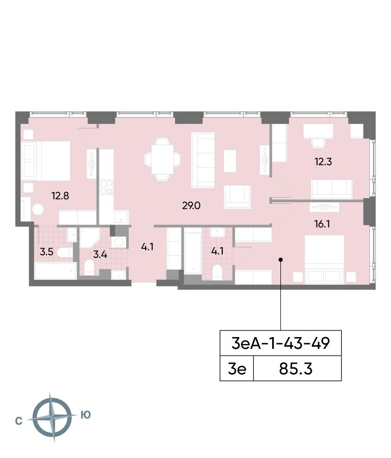 общая 85,3 м2, жилая 41,2 м2, кухни 29 м2 |