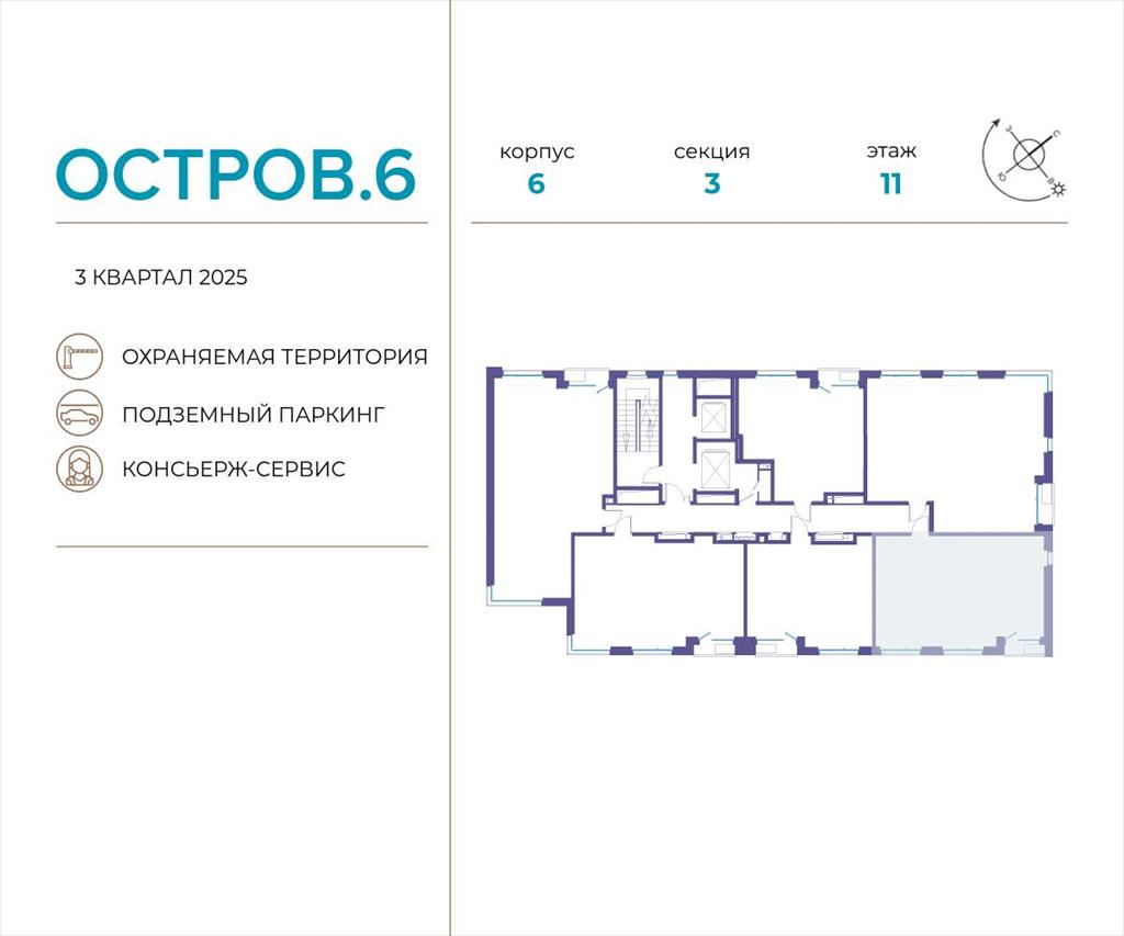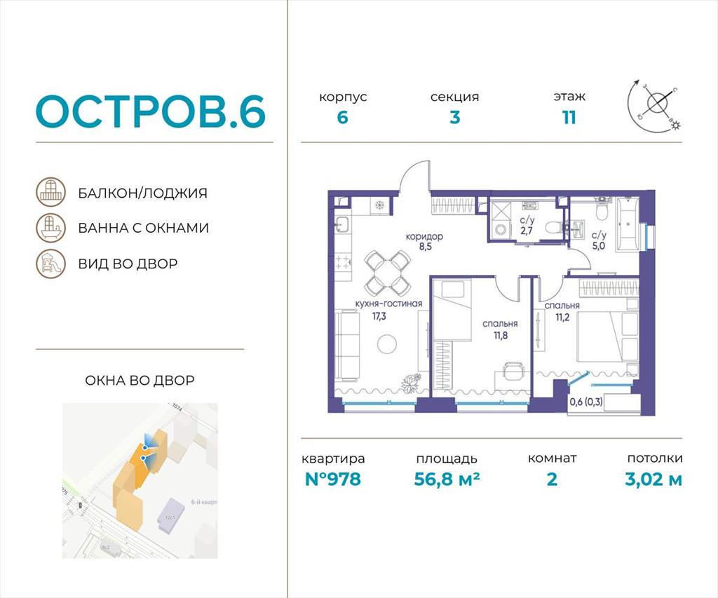 | Продаётся 2-комн. квартира от застройщика: общая площадь 56.80 м, жилая 23.00 м, кухня 17.30 м, 11-й этаж, жилой квартал «Остров 6», корпус 6 (секция 3) . Срок сдачи: 3 квартал 2025 года.