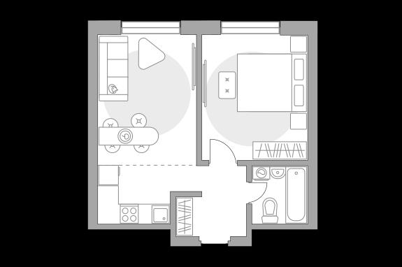 Жилая площадь 26.39 м2, кухня 5.19 м2. Площадь комнат: 13.36/13.03 м2, черновая отделка, окна выходят на улицу.