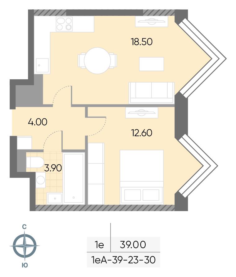 общая 39 м2, жилая 26,5 м2, кухни 4,6 м2 |