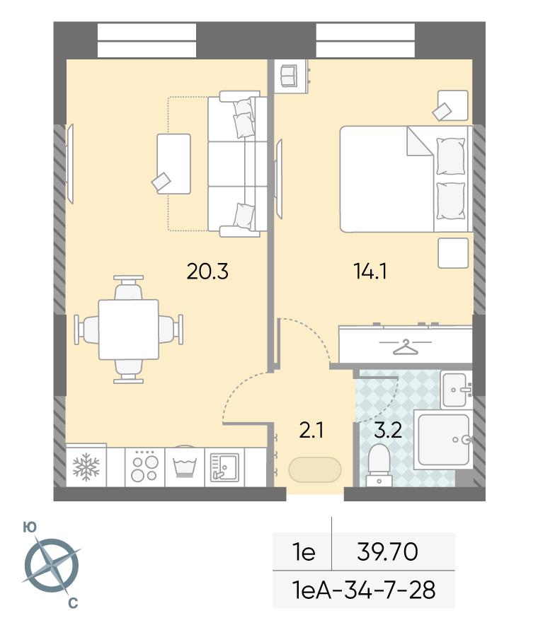 общая 39,7 м2, жилая 28,4 м2, кухни 6 м2 |