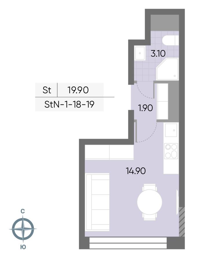 общая 19,9 м2, жилая 10,7 м2, кухни 4,2 м2 |
