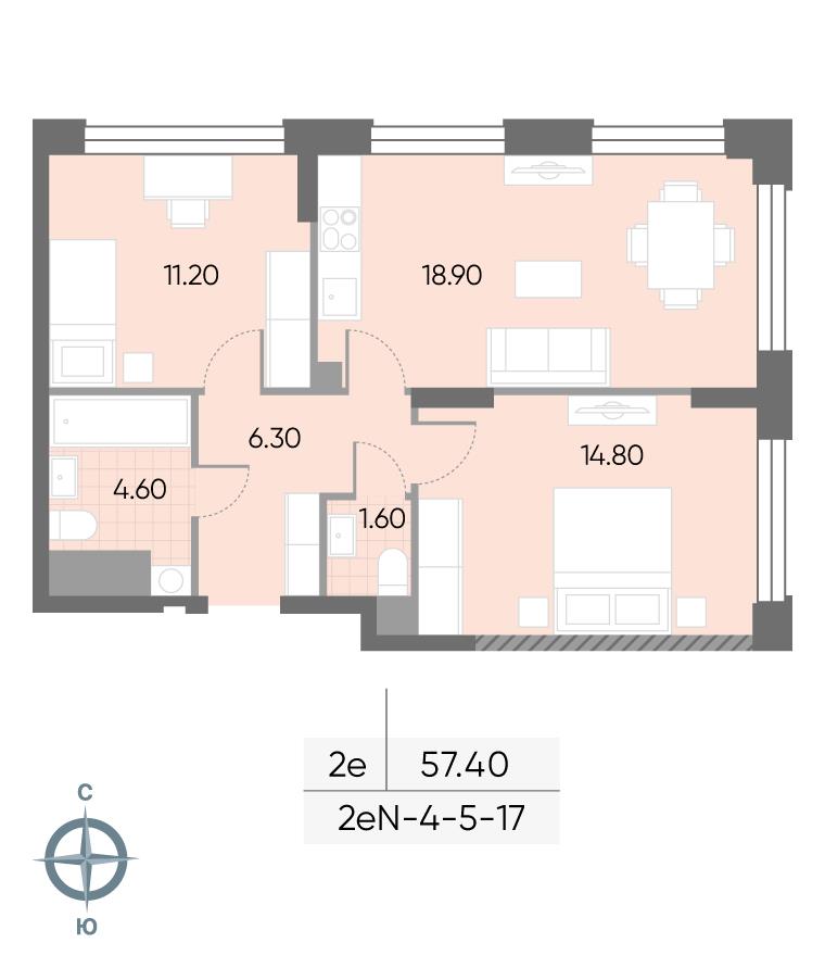общая 57,4 м2, жилая 39,6 м2, кухни 5,3 м2 |