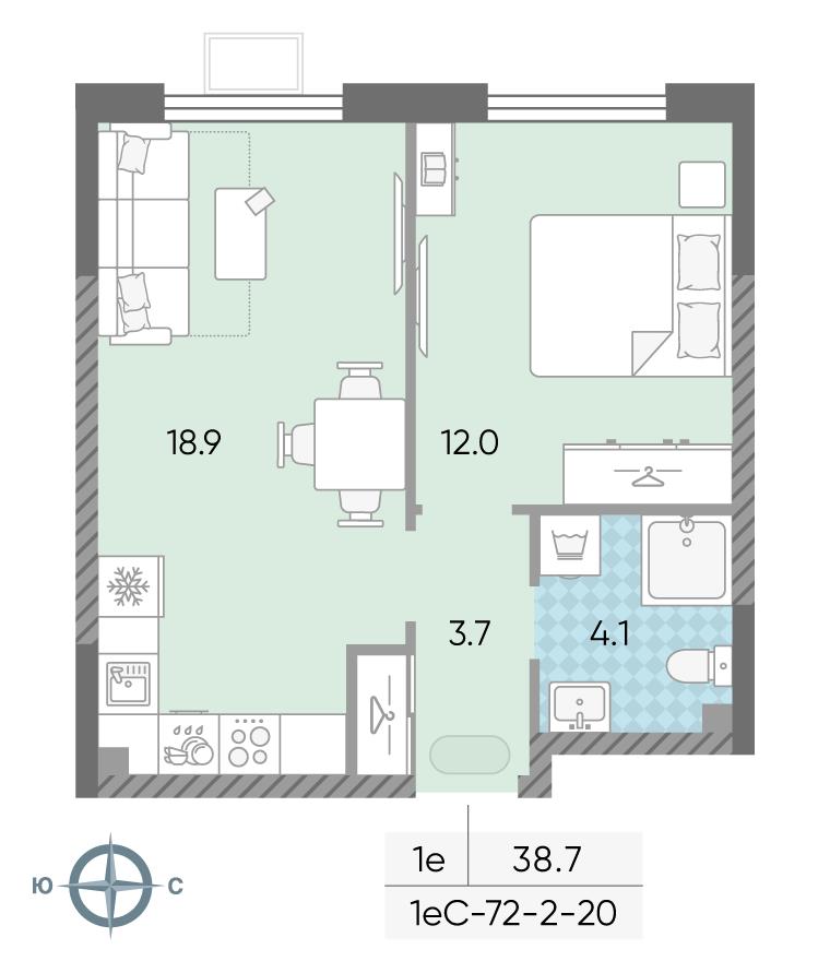 общая 38,7 м2, жилая 24,3 м2, кухни 6,6 м2 |