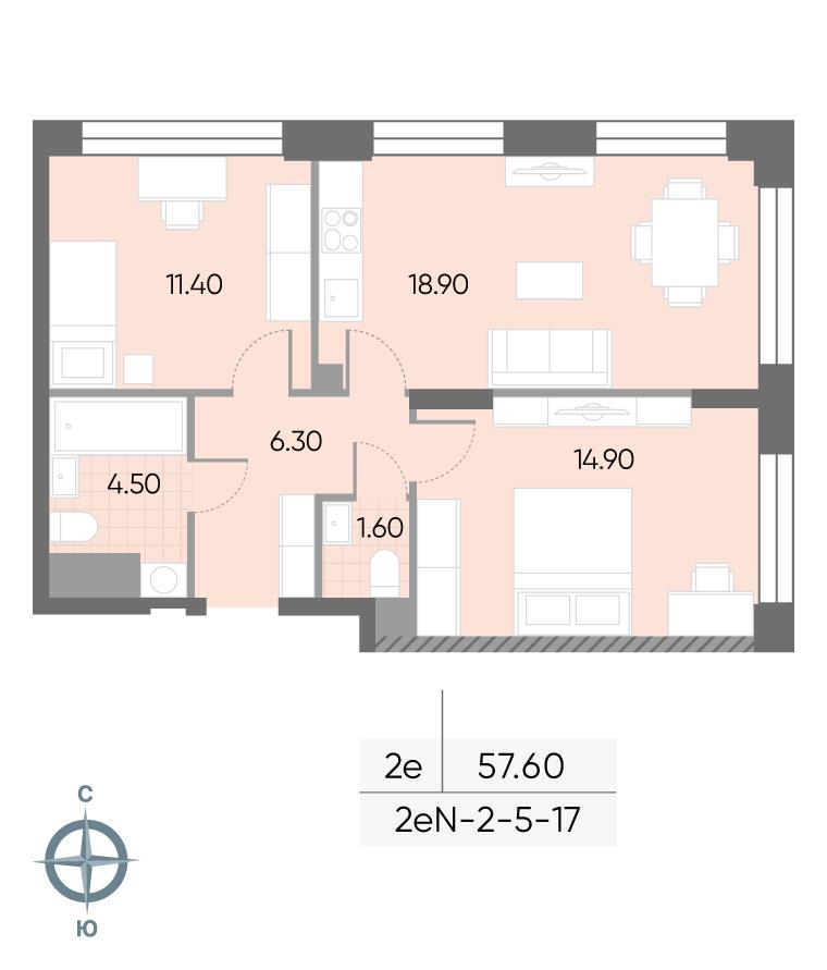 общая 57,6 м2, жилая 39,9 м2, кухни 5,3 м2 |