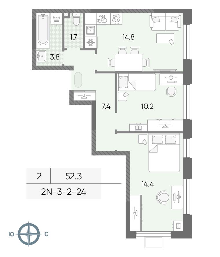 общая 52,3 м2, жилая 34,3 м2, кухни 5,1 м2 |